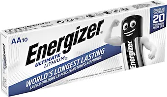 Energizer Ultimate lithiumbatterier L91/AA B2B (10-pack) Energizer Ultimate Lithium håller upp till 11 gånger längre i en digitalkamera jämfört med Energizer Max *. Batteriet är mätt för att kunna hålla upp till 20% längre i trådlösa spelkontroller (t.ex. kontakt till Playstation). Energizer Ultimate Lithium kan hålla temperaturen ner till -40 °C till 60°C. Batterierna väger dessutom endast 1/3 av ett vanligt alkalinebatteri och 50% mindre än ett Ni-MH. Energizer Ultimate Lithium har en livstid upp till 12 år och är ett anti läckage-batteri. That’s positive energy